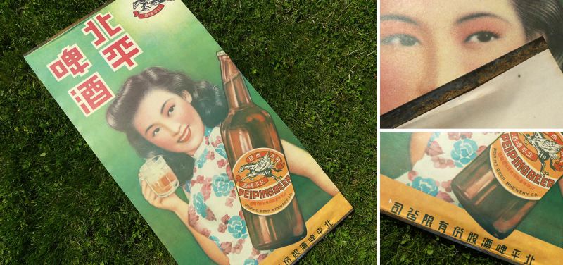 Altes "Peiping Beer" (Beijing) Werbe-Poster mit Metallrand; großartige Vintage-Grafik; abgebildet ist eine junge Shanghai-Chinesin mit einem Glas Bier in der Hand und der alten Peipng-Bierflasche und dem geflügelten Pferdelogo; Peiping (Beijing) war der frühere Name für Peking, die Hauptstadt Chinas; die Originalgrafik stammt aus den 1920er Jahren, dieser Druck wurde vermutlich zwischen 1940 - 1950 produziert; das Plakat stammt aus einem kleinen Restaurant in Schanghai, dem Alter und der Umgebung entsprechende Gebrauchsspuren; Maße: 39 x 76,5 cm