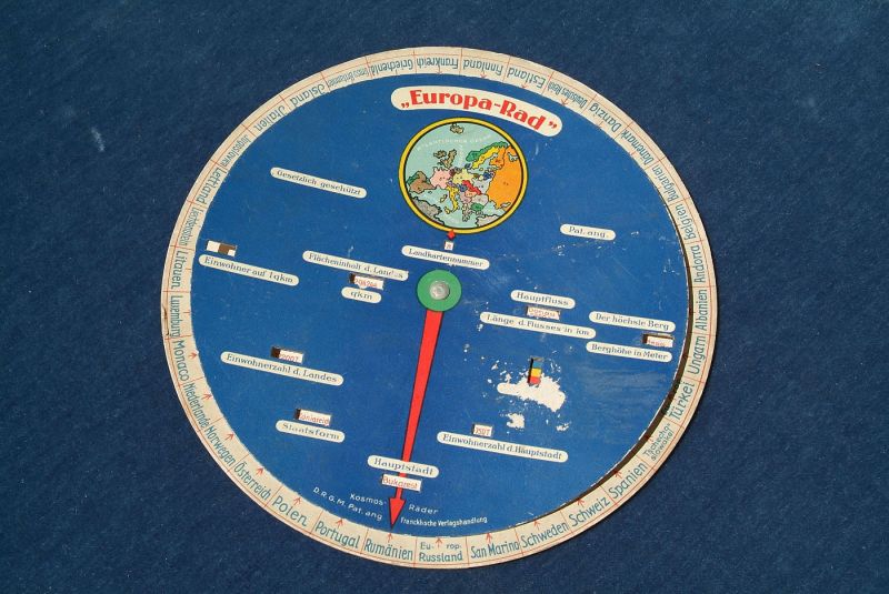 Das Europa Rad aus Karton; Kosmos – Räder D.R.G.M.Pat. Ang. Franckhsche Verlagshandlung; Hauptstädte, Flüsse, Einwohnerzahl des Landes und vieles mehr auf einen Blick für ganz Europa; auf der Rückseite ist das Jahr 1932 vermerkt; dem Alter entsprechende Gebrauchsspuren;
