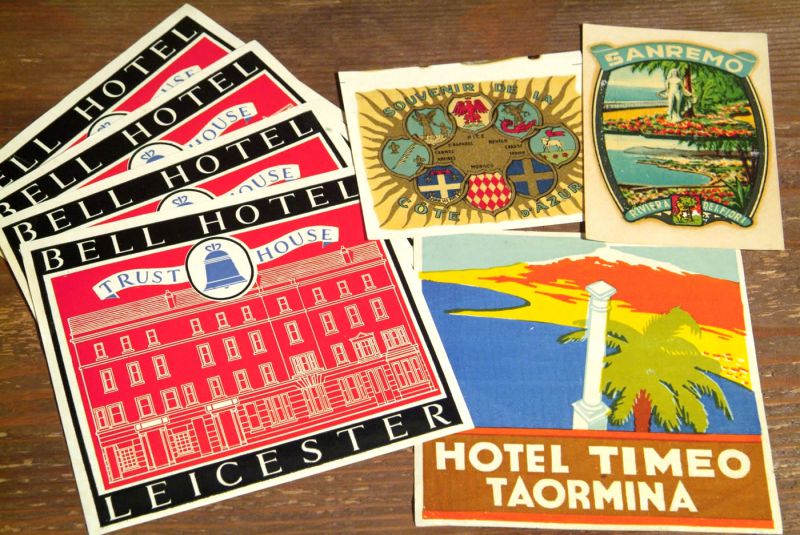 Alte Vintage-Werbeaufkleber aus Italien, England und Frankreich (7 Stück); die Sticker stammen vermutlich aus diversen Reisen in den 50er und 60er Jahren; Tolle Deko für den Reisekoffer, ein Möbel oder das Auto, Klebefunktion nicht geprüft; dem Alter entsprechende Gebrauchsspuren