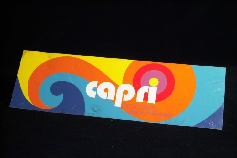 Seltenes Blechschild "capri bracelets pour montres" Frankreich aus den 60er - 70 Jahre; Werbeschild auf Blech; auf der Rückseite Flugrost; dem Alter entsprechende Gebrauchsspuren (siehe Fotos); Maße: 38,3 x 12 cm