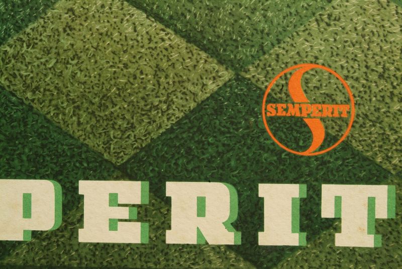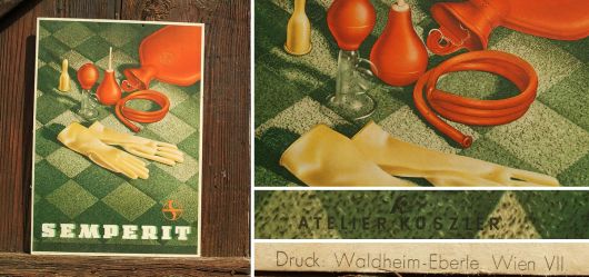 Lithographie aus den 50er Jahren Kartonschild der Marke Semperit; Grafik gestaltet von Atelier Koszler; Druck von Waldheim – Eberle Wien VII; sehr kräftige Farben und sehr guter Erhaltungszustand; Maße: 34 cm x 48 cm
