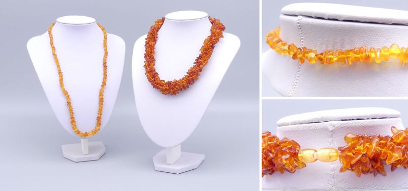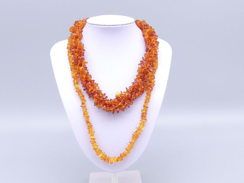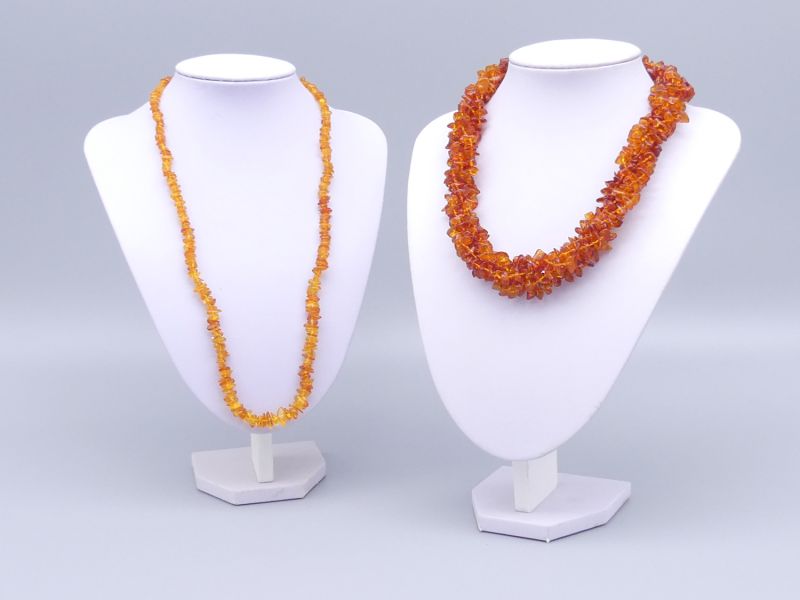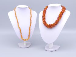 2 Baltische Bernsteincollier aus echtem Bernstein; Baltikum, Mitte des 20. Jahrhunderts. Zwei Elegante Bernsteinketten aus dem Baltikum (Ostsee); grob geformte und natürliche Bernstein-Perlen; helle und etwas dunlkere Honigfarben. 1x Bernsteinkette in Honigfarben aus 5 Strängen geflochten; mit Schraubverschluss (siehe Fotos), Gesamtlänge ca. 49 cm (ca. 70g) und 1x eine Bernsteinkette in hellen Honigfarben, einreihig geschlossen - ohne Verschluss; die Steine sind im Größenverlauf aneinandergereiht; Gesamtlänge ca. 64 cm / ca. 17g Die Bernsteinketten wurde auf ihre Echtheit getestet: - Salzwasserbad > Schwimmt im Salzwasser - Unter UV-Licht wird die charakteristische Farbe angezeigt - Beim vorsichtigen Erhitzen kommt der typische Harzgeruch hervor Das fossile Baumharz gehört seit der Antike zu den ältesten und begehrtesten Schmucksteinen; dem Bernstein wurde schon in der römischen und persischen Zeit eine große Heilwirkung zugeschrieben; im Orient wurde Bernsteinrauch verwendet, um den Geist zu stärken; bis heute wird der Bernstein als Talisman, Heilstein und Schmuckstein eingesetzt und erfreut sich großer Beliebtheit. Die Objekte werden ohne Display angeboten - Dem Alter entsprechende Gebrauchsspuren!