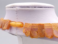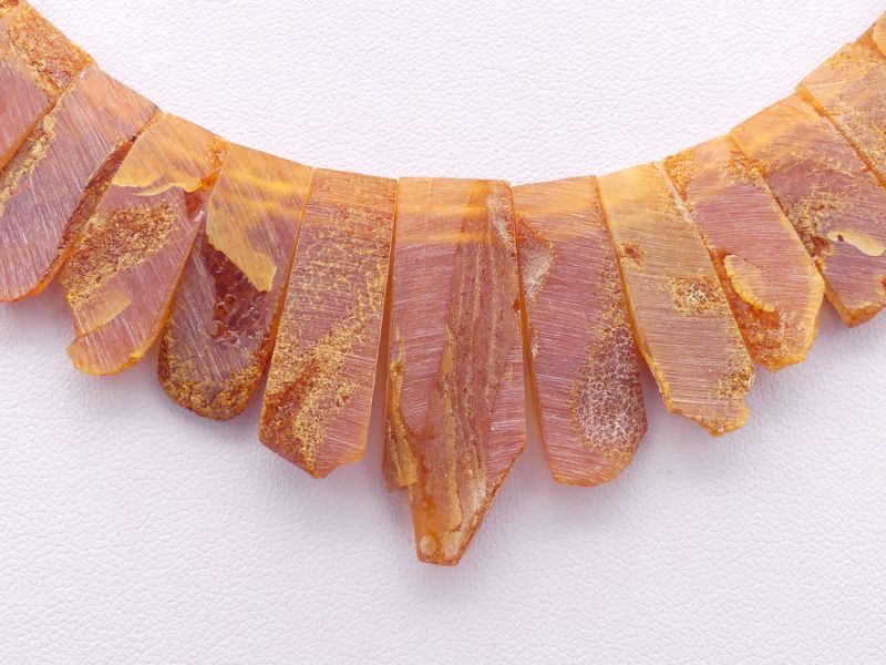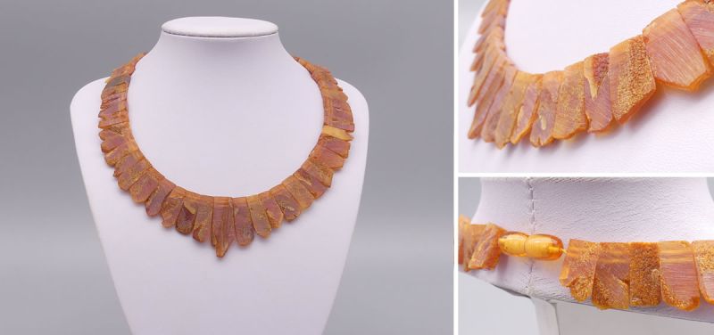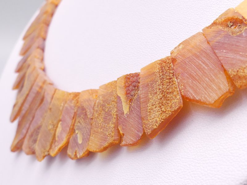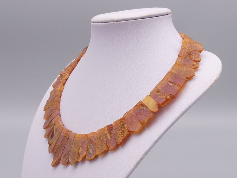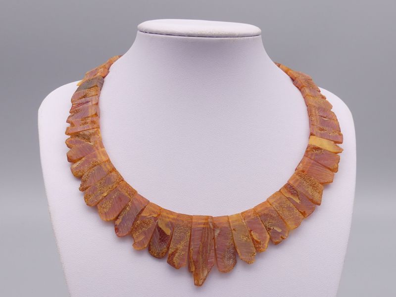 Die Bernsteine sind in einer raffinierten, überlappenden Fächerform angeordnet, die dem Schmuckstück eine besondere Eleganz und ein einzigartiges Design verleiht. Mit einer Länge von circa 46 cm und einem Gewicht von etwa 30 Gramm liegt das Collier angenehm am Hals. Ein sicherer Drehverschluss aus Kunststoff sorgt für ein leichtes Anlegen.