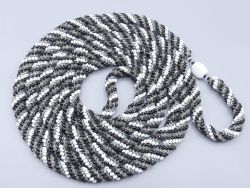 Antike und sehr lange Glasperlenkette (Glasperlenschmuck) im Stil der Wiener Werkstätte; Art Deco; Österreich 1925 bis 1940; Perlenkette mit kleinen schwarzen, weißen und transparenten Glasperlen besetzt und an Seidenschnüre aneinandergereiht; die Kette besteht aus zahlreichen kleinen, mikrofeinen Glaserlen, die akribisch zu einer charmanten und sehr langen Halskette zusammengefügt wurden; sie hat keinen Verschluss und ist eine geschlossene Halskette; Anfang und Ende der Kette werden durch eine größere weiße Glasperle getrennt; dieser filigrane Modeschmuck aus Glas ist ein großartiges Beispiel für die Perlenstickerei des österreichischen Art Deco und werden auch immer wieder in großen Auktionshäuser versteigert; perfekt für Sammler von antikem Modeschmuck; dem Alter entsprechende Gebrauchsspuren; die Maße: Länge ca. 85 cm(Gesamtlänge ca. 170 cm) – Gewicht: 82 g