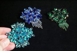 Kleines Konvolut Strass-Schmuck (3 Stück); 3 ausgefallene und funkelnd schillernde Strass-Broschen mit hellblauen, dunkelblauen und grünen Strasssteinen; vermutlich Gablonz (Böhmen), Mitte 20. Jahrhundert; jeder Strass-Stein ist einzeln gefasst, die Basis ist aus Messing und auf der Rückseite sieht man noch die alten Lötstellen der alten Handwerkskunst, dem Alter entsprechende Gebrauchsspuren; Maße Hellblau: ca. 6,5 x 6,5 cm – Dunkelblau: 6,5 x 9 cm – Grün: 6 x 8,8 cm