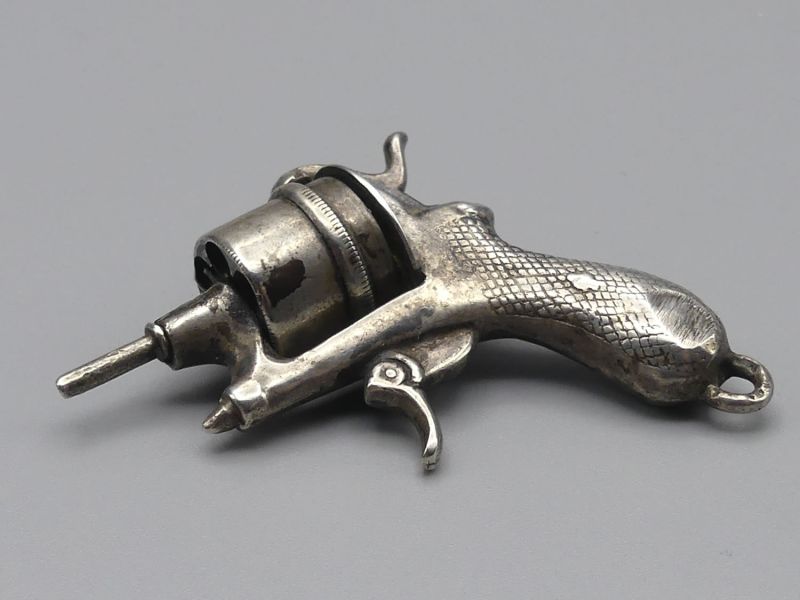 Dieser detailreiche antike Anhänger in Form eines Trommelrevolvers ist ein faszinierendes Sammlerstück aus der Zeit des späten 19. Jahrhunderts. Die Miniatur stellt einen typischen europäischen Taschenrevolver dieser Ära dar, wie er zur Selbstverteidigung üblich war. Die aus silberfarbenem Metall gefertigte Figur besticht durch eine authentische Patina, die das historische Alter unterstreicht. Das besondere Highlight ist die funktionale, drehbare Trommel. Die einzelnen Patronenlager sind mit kleinen, runden Glaseinsätzen versehen, die das Aussehen geladener Kammern imitieren, ein liebevolles Detail der Handwerkskunst. Der Griff weist eine feine Fischhaut-Struktur auf. Der Anhänger besitzt eine feste Öse am Griffende zur Befestigung an einer Kette oder einem Charivari. Es handelt sich um eine unpunzierte Metalllegierung, keine Punzen; der Anhänger wurde nicht auf Silber geprüft.