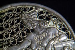 Seltene Silber-Brosche von der „Bezalel Academy of Arts and Design“; um 1950 - Israel; die „Bezalel Academy“ ist die bedeutendste Kunstschule in Israel und wurde 1906 gegründet; auf der Brosche ist die biblische Figur „Königin Esther (אֶסְתֵּר)“ dargestellt, Frau des persischen Königs Xerxes I.; das Esther-Motiv ist eines der seltensten und im traditionellen Bezalel-Stil hergestellt; auf der Rückseite gestempelt: „Israel ST. 925“; dem Alter entsprechende Gebrauchsspuren; Maße: Ø 4,3 cm