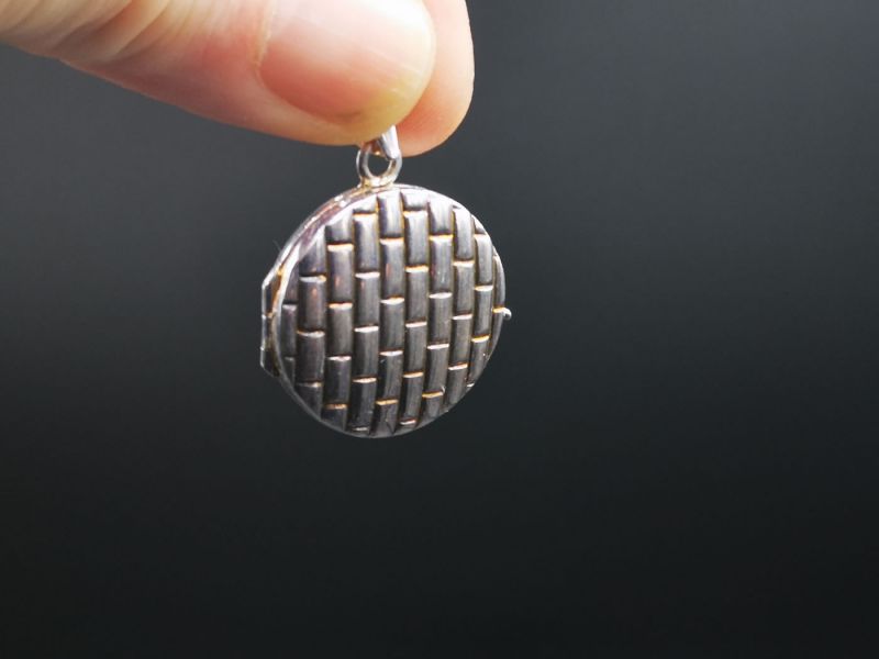 Charmantes Foto-Medaillon zum Öffnen; vermutlich aus den 1950er Jahren; gestempelt 925 (Silber); Vorderseite mit Backsteinmuster, Rückseite Glatt; Innenseite beidseitig mit Glasdeckel für Photographien gedacht; lässt sich problemlos öffnen und schließen; Maße: Ø 2,7 cm Gewicht: 10,2 g; dem Alter entsprechende Gebrauchsspuren