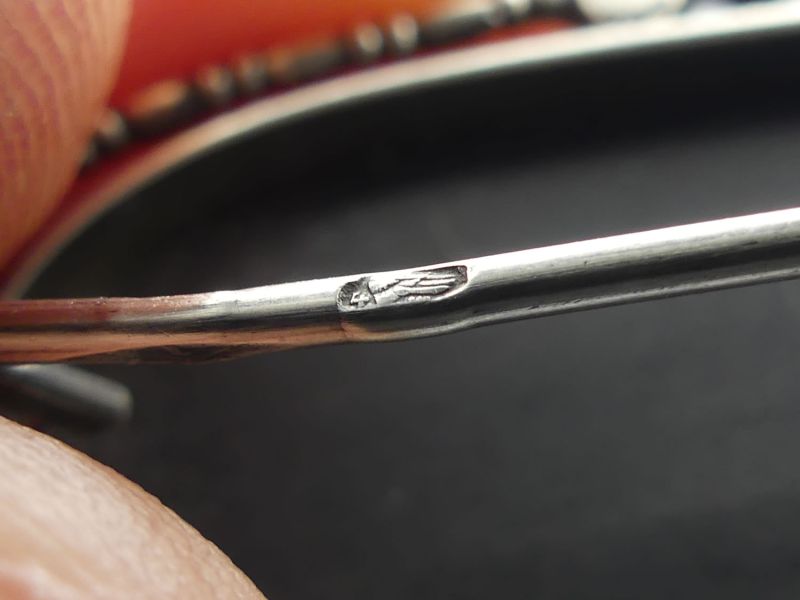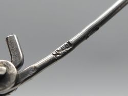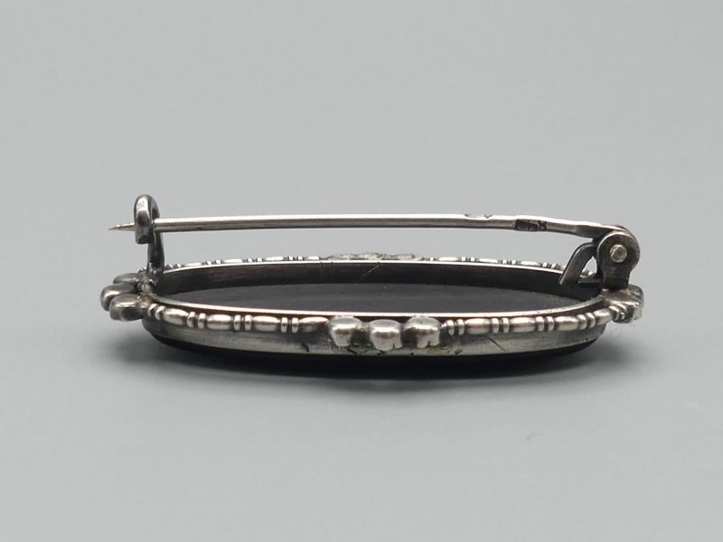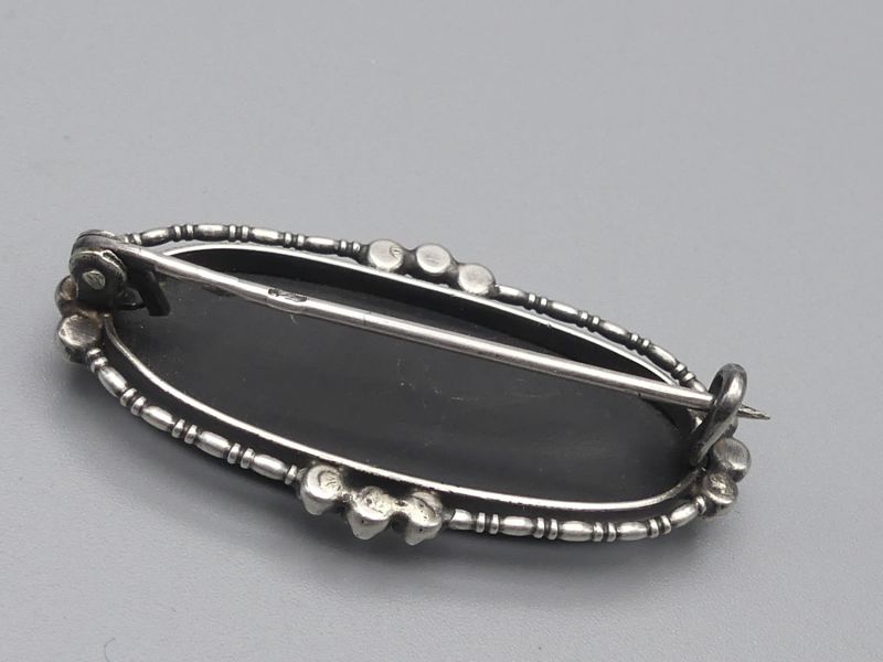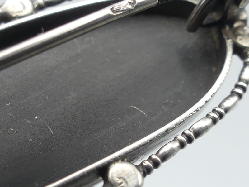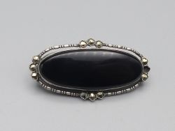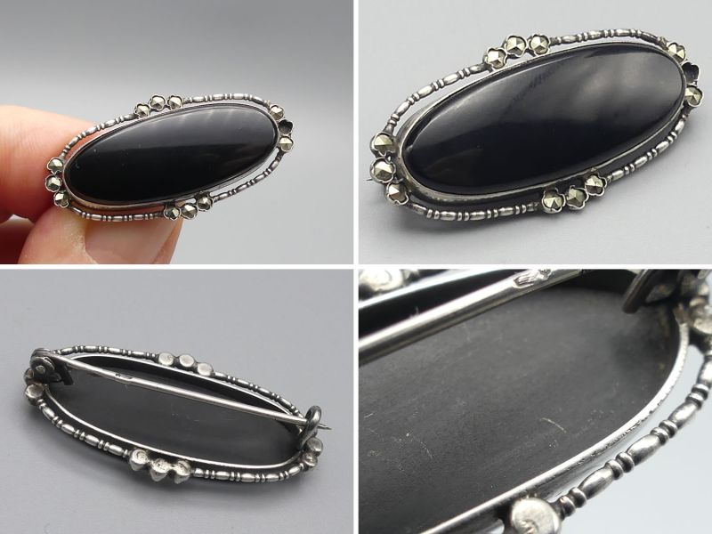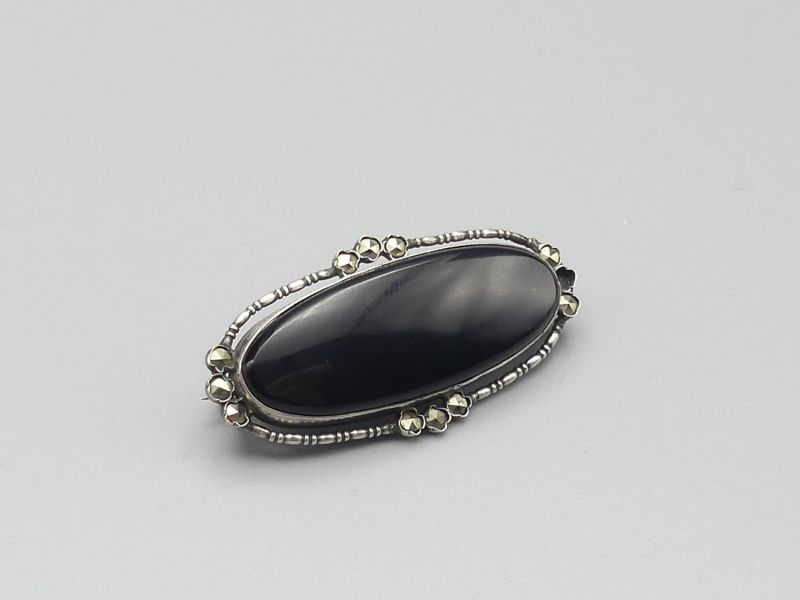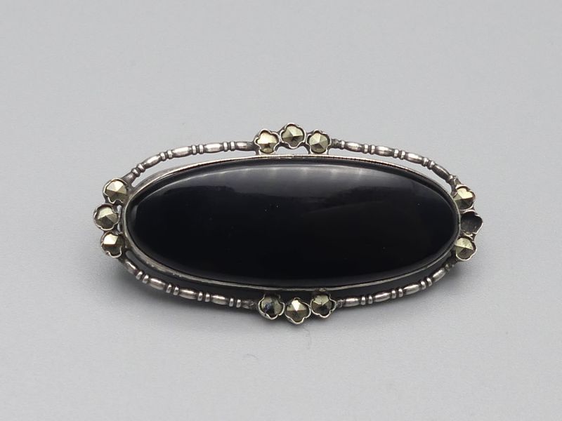 Diese elegante Vintage Brosche aus achthunderter Silber besticht durch einen tiefschwarzen Onyx im Glattschliff umrahmt von funkelnden Markasiten. Das handgefertigte Unikat vereint nostalgischen Charme mit zeitloser Eleganz. Ein besonderes Highlight ist die amtliche Punzierung auf der Nadel mit dem Taubenflügel und der Ziffer vier, was für geprüftes Silber ab 1925 steht. Die Brosche verfügt über eine sicher schließende Nadel. Bitte beachten Sie, dass ein kleiner Markasit Stein fehlt, was dem antiken Gesamtbild jedoch keinen Abbruch tut; dem Alter entsprechende Gebrauchsspuren (siehe Fotos); Maße: ca. 3,5 x 1,7 cm / 4,5g