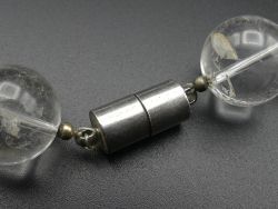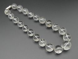 Schwere Halskette mit großen natürlichen Bergkristall-Kugeln; Ende 20. Jahrhundert; Einschlüsse sind gut zu erkennen; die Kugeln sind im Größenverlauf von 1,8 bis 2,5 cm Durchmesser; die Steine sind einzeln verknotet; mit Magnetverschluss; bei ein paar Kugeln ist das Glas etwas gerissen, aber alles noch vorhanden (Ssiehe Fotos), teilweise zerkratzt; dem Alter entsprechende Gebrauchsspuren; Maße: ca. 49 cm Länge – Gewicht: 244 g