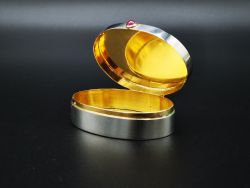 Sehr exklusive und hochqualitative ovale Silberdose (Pillendose) mit Scharnier-Deckel (1940 - 1950); am Verschluss ein kleiner Edelstein; Rubin-Carbochon; Punziert: „CW“; Silbergehalt: 800; der Deckel und die Innenseite sind vergoldet; dem Alter entsprechende Gebrauchsspuren; Maße: 3 x 4,2 x1,4 cm / Gewicht: 29 g