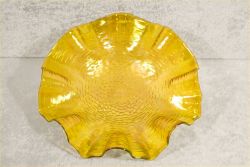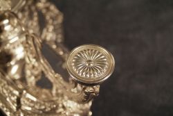 Versilberter Tafelaufsatz mit Schalenaufsatz (Tafelaufsatz) aus Grünen geschwungenen Glas (irisierende Schale); Zerlegbar in 8 Teilen; Der Mittelteil aus geätzten Metall stellt eine Jagdszene dar "Hirsch neben Eiche"; in der Mitte des Stückes sollte eine Glas- Steckvase sein, die leider nicht mehr vorhanden ist; Manufaktur ist leider unbekannt; Maße: 41 cm x 40 cm
