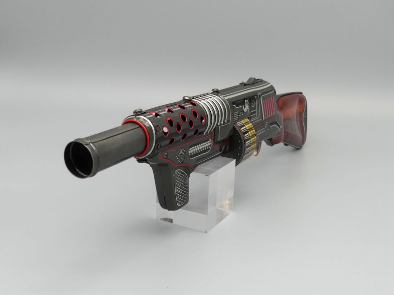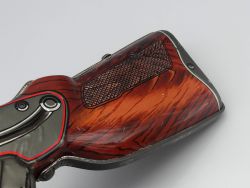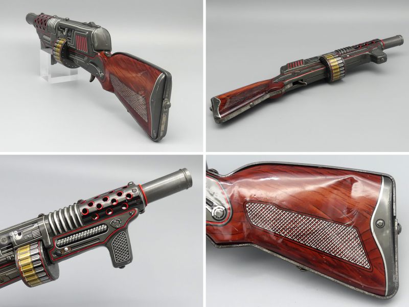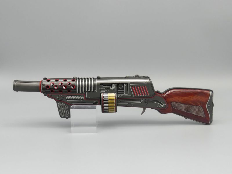 Die interne Mechanik ist grundsätzlich funktionsfähig und beim Betätigen des Abzugs erzeugt das Gewehr das typische ratternde Geräusch wobei anzumerken ist dass der Mechanismus altersbedingt bereits etwas ausgeleiert wirkt, was dem authentischen Spielzeug-Charakter jedoch keinen Abbruch tut. Trotz der fehlenden Originalverpackung bleibt dieses Maschinengewehr aufgrund der Seltenheit von Objekten dieser Ära ein hochinteressantes Exponat für Kenner und Liebhaber historischer Spielzeug-Kuriositäten. Dem Alter entsprechende Gebrauchsspuren; Maße: 12 x 49 x 4 cm