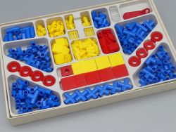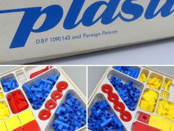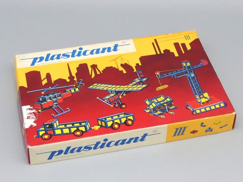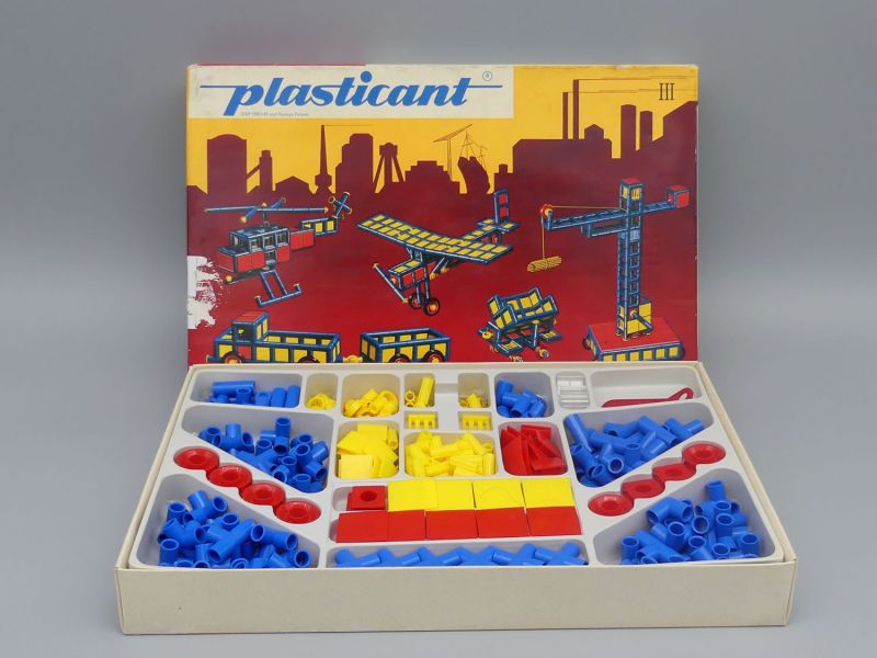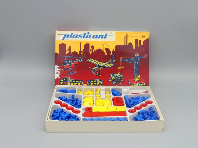 Der hier angebotene Plastikant III Baukasten mit der Kennzeichnung „DBP 1090143 and Foreign Patents“ stammt aus den siebziger Jahren und wurde in Deutschland produziert. Es handelt sich um ein Vintage Konstruktionsspielzeug das als ut befüllten Ergänzungskasten oder Ersatzteilspender dient da der Inhalt unvollständig ist. Die Bauelemente weisen altersbedingte Gebrauchsspuren auf und bei einer geringen Anzahl an Teilen sind kleine Stellen ausgebrochen was bei diesem Material nach über fünfzig Jahren vorkommen kann. Dieser Kasten ist ideal für Sammler oder Bastler die ihren eigenen Bestand an Plastikant Steinen und Verbindern erweitern möchten um größere Modelle zu realisieren. Die Beschreibung fehlt; dem Alter entsprechende Gebrauchsspuren; Maße: 23 x 36 x 5 cm