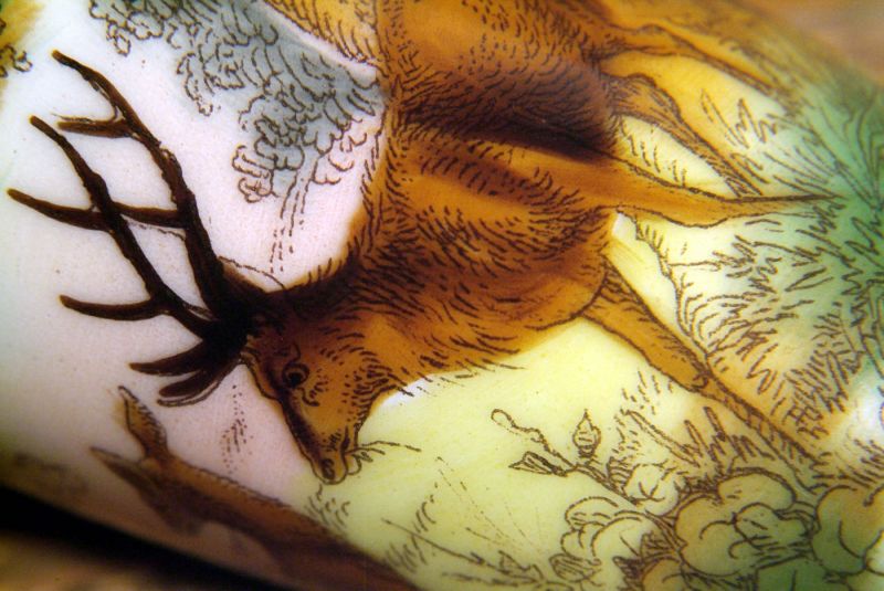 Antike Porzellanpfeife (Tabakpfeife) aus Deutschland (um 1900); schönes Sammlerobjekt; polychrom bemalt (Hirsch und Reh im Wald); Porzellankopf auf der Rückseite beschriftet: „Tabak-Fabrik von P. J Landfried Heidelberg“; Mundstück beschädigt; dem alter entsprechende Gebrauchsspuren; nicht gereinigt – im Originalzustand; Maße: ca 18 cm