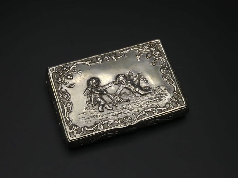 Silberdose / antike Tabatiere mit Reliefdekor - innen vergoldet; auf dem Deckel 2 Putto umgeben von Früchten und Blättern; Rechteckige Form mit Scharnierdeckel; Die Seiten tragen ebenfalls ein Reliefdekor mit Blüten und Engelsköpfen;Import Mark: An der Schließe - Lily (fleur-de-lis) and letter C above silver hallmark, Czechoslovakia 1929 – 1942, Silbergehalt 800, Zusätzlicher Stempel am Boden Halbmond und Reichsapfel mit Meisterzeichen (Schlechte Prägung, schwer leserlich); Maße: 9 x 6 x 1,5 cm / 100,8 g