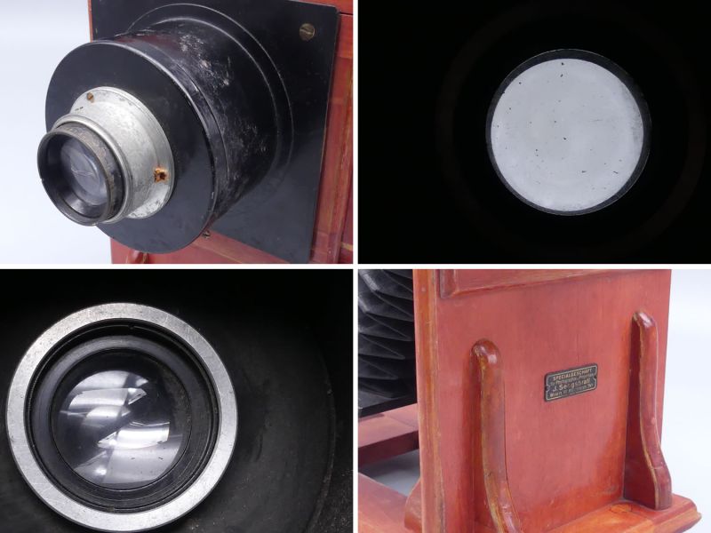 Teil einer antiken Großformatkamera um 1900; von „J. Sengsbratl“ - Specialgeschäft für Photographie und Projection (Erzherzoglicher Kammerlieferant); aus Wien VII, Mariahilferstraße 74b; der vordere Holzrahmen, die untere Holzschiene, Faltenbalg und Objektiv sind vorhanden; das Objektiv stammt von "Müller & Wetzig Dresden Jdeal – Doppel-Anastigmat - Nr. 244729" Objektiv in einem schlechten Zustand; Schrauben rostig, das Glas hat starke Gebrauchsspuren; die Kamera ist ein reines Restaurierungsobjekt oder kann als Ersatzteillager genutzt werden; Funktion und Vollständigkeit nicht geprüft; Maße Holzrahmen: 29,5 x 16 cm x 41 cm – Maße Balken Umfang 13,5 x 13,5 cm; dem Alter entsprechende Gebrauchsspuren;
