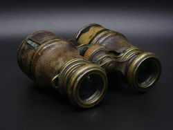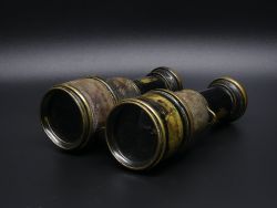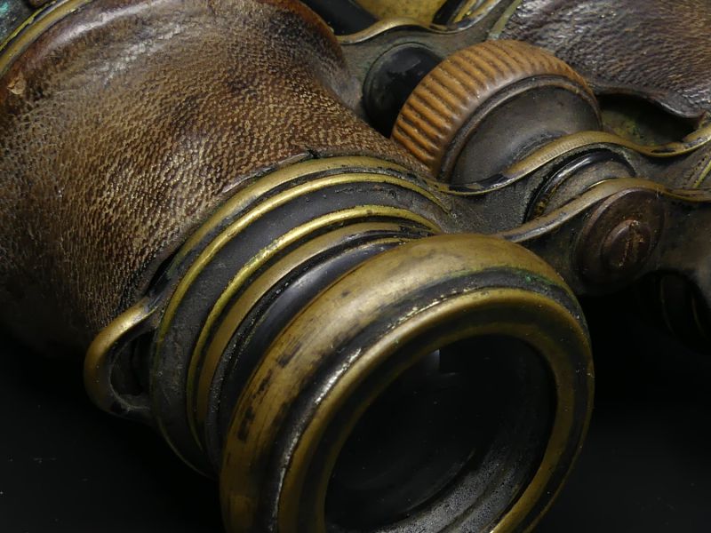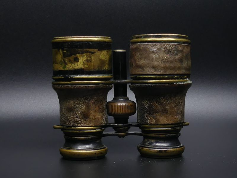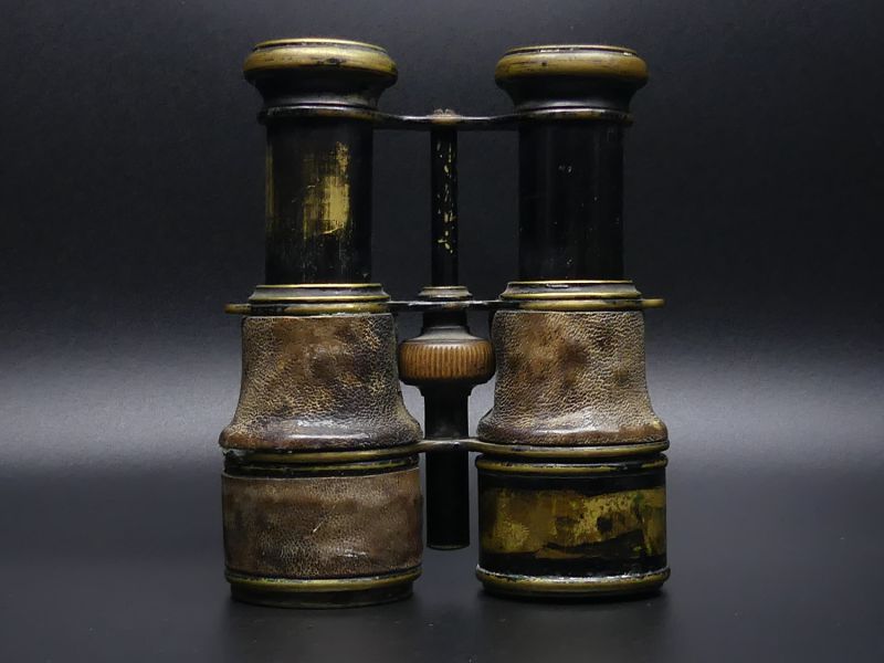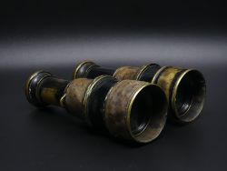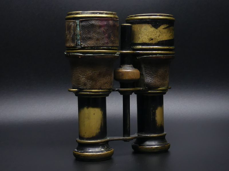 Dieses Fernglas ist ein Stück optischer Handwerkskunst aus dem 19. Jahrhundert. Gefertigt aus Messing mit einer umlaufenden Lederummantelung, ein Lederstück fehlt, eines klebt nicht mehr und ist beweglich. Die Maße betragen geschlossen 11 x 12 cm und geöffnet circa 13,5 x 12 cm, was es zu einem Modell mit komfortabler Handhabung macht. Die Mechanik des Einstellrades ist etwas ausgeleiert. Die Gläser sind in einem guten Zustand, obwohl auch hier die typischen altersbedingten Kratzer vorhanden sind. Wie bei vergleichbaren antiken Stücken weist der Messingrahmen altersgemäße Dellen und Gebrauchsspuren auf. Dieses Fernglas ein attraktives Sammlerstück, das als stilvolles Dekorationselement in jedem klassischen Interieur einen Blickfang bildet; dem Alter entsprechende Gebrauchsspuren.