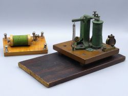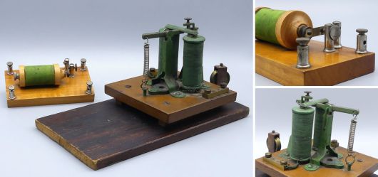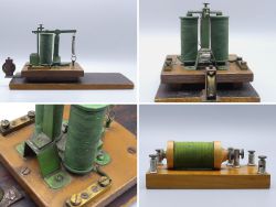 Zwei seltene Lehrmittel zur Elektrizitätslehre aus dem 19. Jahrhundert, einst Teil einer alten österreichischen Sammlung. Diese antiken physikalischen Objekte bieten einen faszinierenden Einblick in die Wissenschaftsgeschichte. Im Konvolut enthalten: 1x antikes Relais - hier dürfte es sich vermutlich um ein seltenes Telegrafenrelais (zb. für ein Morsegerät) auf Holzplatte montiert handeln; diese T-Relais waren ein wichtiger Bestandteil in der Kommunikationstechnik, das Relais verstärkt schwache elektrische Signale und leitete sie weiter, um Nachrichten über große Entfernungen zuverlässig zu übertragen; Maße: 13 x 24,5 x 12 cm; das zweite Objekt ist 1x ein historischer Funkeninduktor mit grüner Spule, eine Veranschaulichung der induktiven Erzeugung von Hochspannungsimpulsen, ebenfalls auf einem Holzsockel montiert; Maße: 6,5 x 12 x 4 cm; beide Unterrichtshilfen besitzen eine schöne natürliche Patina und zeigen einen großartigen Einblick in die Geschichte der Elektrizität; auf Vollständigkeit und Funktion nicht überprüft; Roststellen; im Fundzustand belassen; dem Alter entsprechende Gebrauchsspuren;