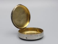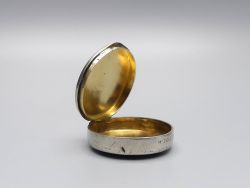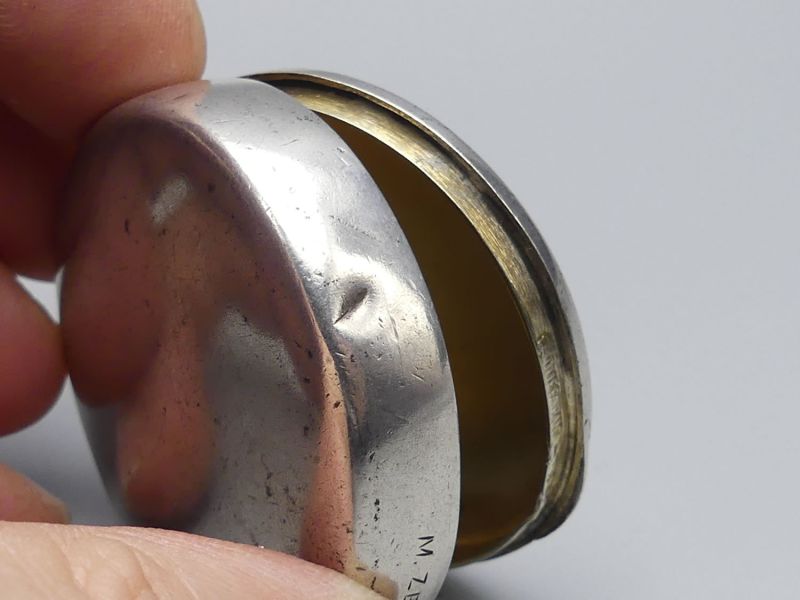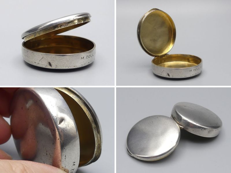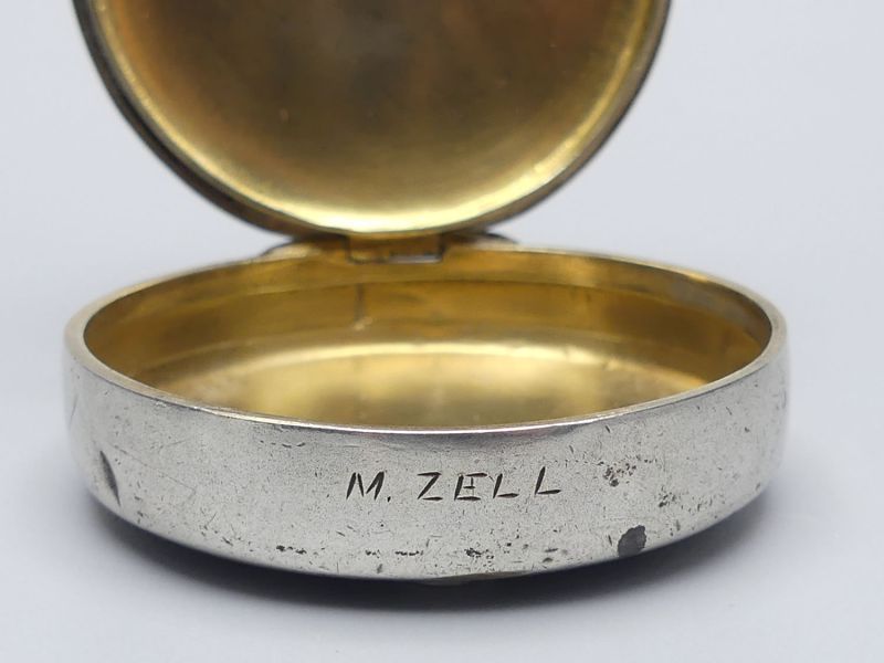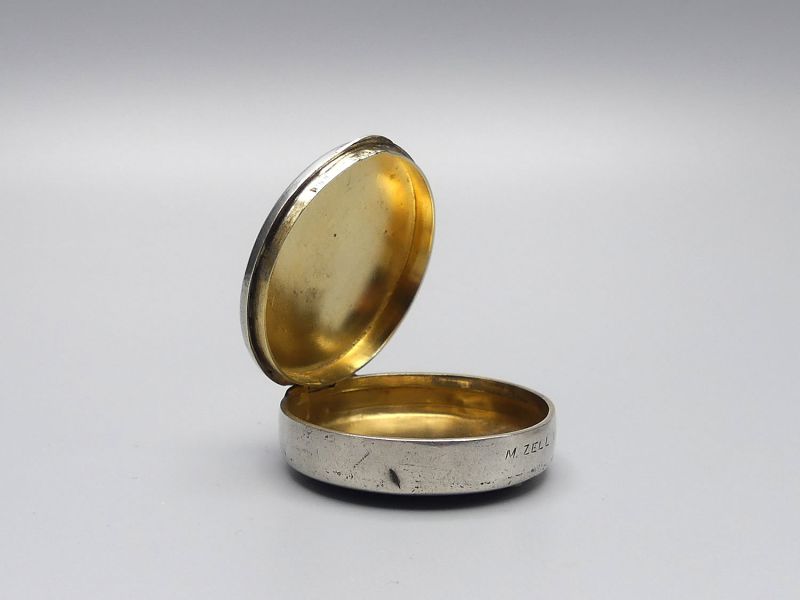 Diese außergewöhnliche Dose aus der Mitte des 20. Jahrhunderts ist ein bedeutendes Stück sakraler Kleinkunst mit direktem Bezug zum berühmten österreichischen Wallfahrtsort Mariazell. Am vorderen Rand befindet sich die Gravur M. Zell, was auf die Herkunft aus diesem bedeutenden spirituellen Zentrum hindeutet. Die Dose wurde höchstwahrscheinlich als Hostiendose (Versehpatene) für die Krankenkommunion oder als hochwertiges Behältnis für religiöse Andenken genutzt. Das Gehäuse ist versilbert und verfügt über eine edle Innenvergoldung welche rituell vorgeschrieben war, um den heiligen Inhalt zu schützen. Am Deckelrand befinden sich 2 unbekannte Punzen, die auf eine handwerkliche Fertigung hinweisen wobei ein Stempel nur zur Hälfte sichtbar ist. Das Material wurde nicht geprüft.