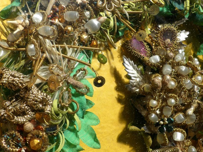 Antiker Hochzeitschmuck – Brautkranz und Gesteck (Im Stil einer Klosterarbeit - Votivbild Diorama), welches von einem Brautpaar um 1900 (1890 – 1910) in Auftrag gegeben wurde; die Kunstwerke (Brautkranz und Anstecker für Braut und Bräutigam) sind hinter Glas montiert; der Schmuck ist eine aufwändige Handarbeit, . reich besteckt und filigran gearbeitet aus Glasperlen; Federstiele, mit Pailletten, Gold- und Silberfäden, etc. geschmückt; ein großartiger Wand-Schmuck für den Landhausstil oder dem Shabby chic, für Liebhaber religiöser Heimdekoration; dem Alter entsprechende Gebrauchsspuren; Maße: ca. 31,5 x1 38,5 x 6,5 cm