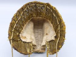 Sehr seltene und gut erhaltene Goldene „Gupfhaube“, auch „Reiche Haube“ oder „Wiener Haube“ genannt; Ende 18. – Anfang 19. Jahrhundert (um 1800); drahtverstärkt und reich bestickt; Volkskunst in Museumsqualität; die Goldschnüre sind am Ende etwas zerfranst (siehe Fotos); das Innenfutter hat leichte Verfärbungen (Tragespuren); ab dem Mittelalter war die Haube ein Statussymbol der Frauen; ab 1889 wurde das Ende der Kleiderordnungen eingeleitet und privilegierte Bürger konnten Kleidungsstücke tragen, die vorher nur dem Adel vorbehalten waren; somit ist diese Gupfhaube ein recht frühes Objekt der neuen Kleiderordnung; dem Alter entsprechende Gebrauchsspuren (siehe Fotos); Maße gesamt ca. 25 cm hoch – Das hintere Haarteil hat eine Größe von 8 x 9 x 17 cm